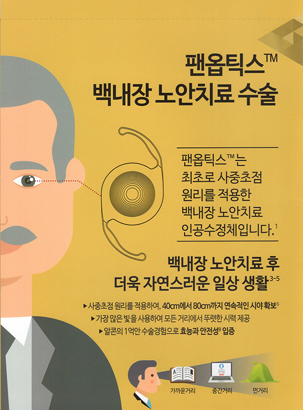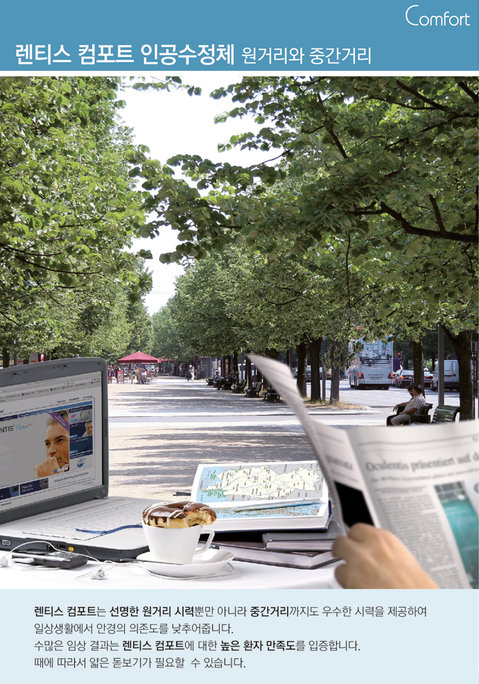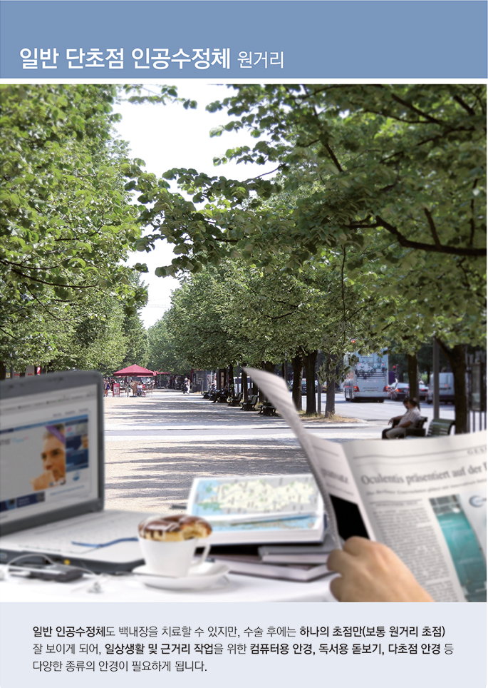 | 장점 | · 원거리뿐만 아니라 중간거리(생활거리)까지도 잘 보임 · 고가의 다초점 인공수정체에 비하여 합리적인 비용 |