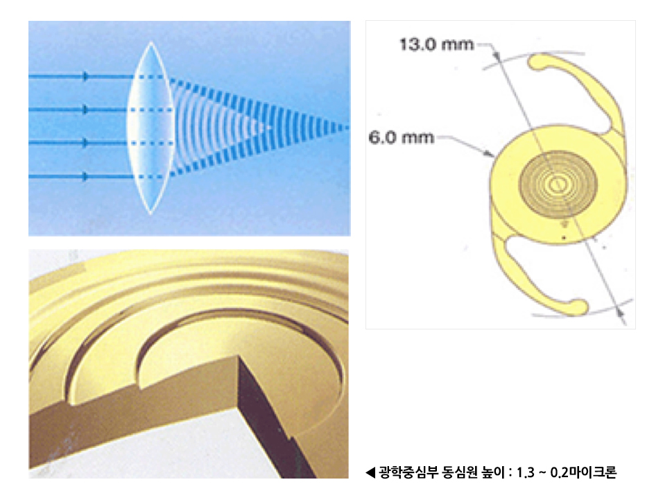 백내장 수술 시 혼탁한 수정체를 대신하는 인공수정체의 광학부의 구성이 앞표면은 비구면 처리가 되어있어 시력의 질(functionalvision)을 높이고, 렌즈후면은 회절처리(diffractive)가 되어 원근거리 초점을 동시에 맞춥니다.